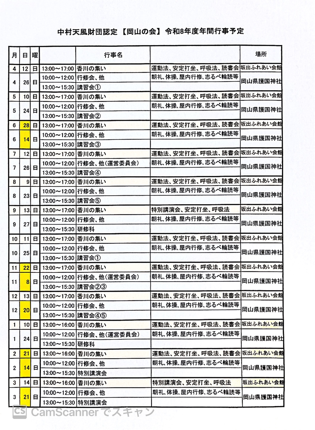*令和8年4月か5月に岡山の会主催の1泊行修会をやろうと実行委員会が立ち上がりました。楽しく天風道を学ぶ会にしたいと思います。ご参加よろしくお願いいたします。